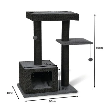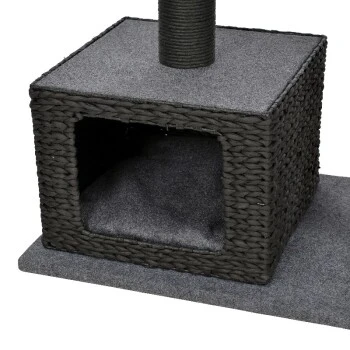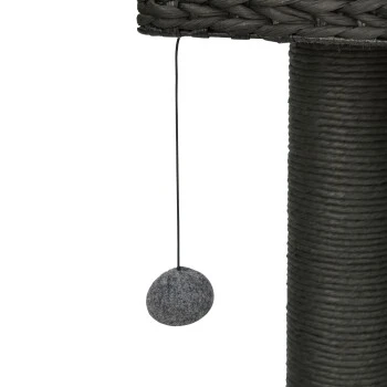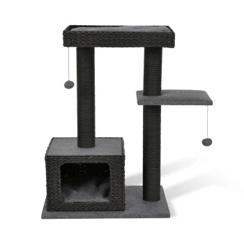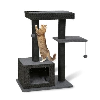 Der AniOne Kratzbaum Nancy überzeugt dabei nicht nur optisch sondern auch funktional auf ganzer Linie. Das Flechtmuster der Höhle und des Liegesofas sorgt für eine hohe Luftdurchlässigkeit. Die dunkelgrauen Filzkissen lassen sich bei Bedarf leicht abnehmen und bei 30° waschen. Durch die edle Farbgebung in Schwarz- und Grautönen fügt sich der Kratzbaum so ideal in jede Raumeinrichtung ein und wirkt hochwertig und zeitlos. Ausreichend Rückzugmöglichkeiten bieten die kuschelige Höhle sowie die Liegeflächen auf zwei unterschiedlichen Ebenen. Das tägliche Kratzbedürfns kann Ihr Stubentiger darüber hinaus ausgiebig an den robusten Kratzstämmen ausleben. Für zusätzlichen Beschäftigungsspaß sorgt das freischwingende Spielelement, dass zum Fangen und Spielen animiert. So vereint der AniOne Kratzbaum Nancy alles wonach sich Ihre Katze sehnt: kuschelige Liegeplätze zum Beobachten und Entspannen, ausreichend Kratzmöglichkeiten und unterschiedliche Ebenen zum Erkunden und Klettern.